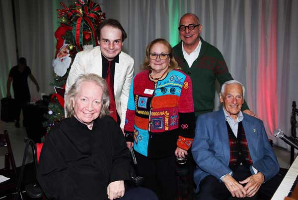 Event Chair. Leo Milmet, ACT for MS president Ann Greer and emcee Patrick Evans standing. Seated are Pianists John Bayless and Bill Marx.