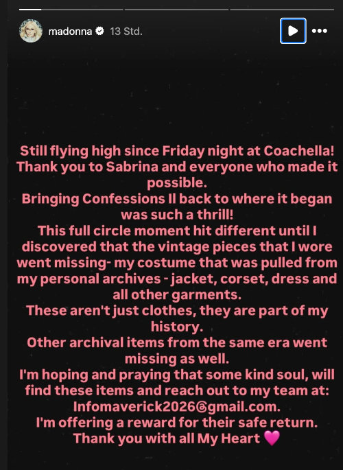 In a hopeful appeal, Madonna has offered a reward for the safe return of the items, urging anyone with information to contact her team.